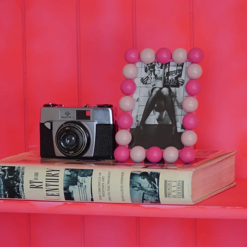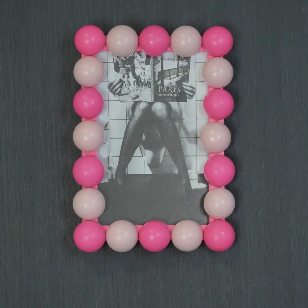 The HOUSEVITAMIN Bubbles Photo Frame Light/Neon Pink blends softness and boldness in a playful, modern design. The distinctive beaded edge and two-tone pink finish make it a cheerful decorative highlight.