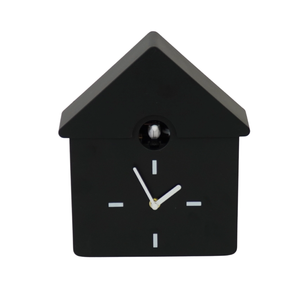 Μοντέρνο cuckoo ρολόι τοίχου της HOUSEVITAMIN σε μαύρο χρώμα, με playful design, ρυθμιζόμενο ήχο και δυνατότητα τοποθέτησης σε τοίχο ή επιφάνεια.
